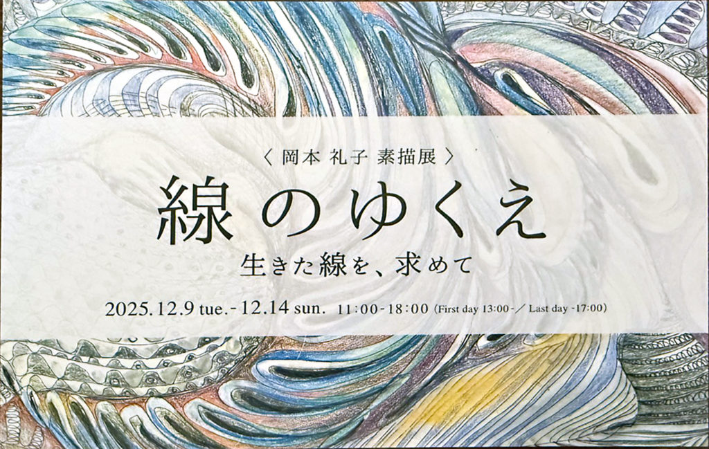 イベント情報/お知らせ 岡本礼子素描展 —線のゆくえ— 生きた線を,求めて 2025年12月10日 by 隆一 岡崎 会期 2025年12月9日(火)~2025年12月14日(日)11:00-18:00 初日13:00〜,最終日 〜17:00 gallery 718 [SPACE A] 広島市中区袋町7-18TEL 082-247-1010